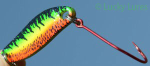 Dieser 10 Gramm schwere CROC mit dem Farbmuster FIRE TIGER ist genauso groß und hat die gleiche Form, wie sein kleiner Bruder eine Gewichtsklasse tiefer. Das hat einen einfachen Grund: er wird aus einem dickeren Metall gefertigt. Mit seiner Länge von 5,5 cm lässt er sich daher weiter werfen und er ist unempfindlicher bei Strömungen und widrigen Windverhältnissen. Die Grundfarben Hellgrün, Gelb und Rot-Orange werden mit kontrastreichen schwarzen Mustern in Flammenform garniert. Zusammen mit der beim Einholen aufblinkenden Nickelbeschichtung auf der Rückseite ist dieser Köder an Auffälligkeit kaum zu überbieten. Alle im Süßwasser raubenden Forellen lieben diesen CROC, aber auch für oberflächennah raubende Meerforellen in Küstenbereichen ist dieser Blinker ideal.