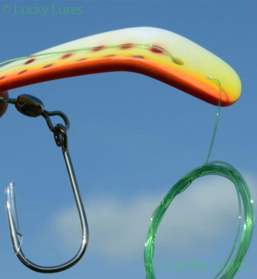 Der einzige Köder, den wir kennen, der auch so funktioniert, ist der Apex von Hot Spot Lures. Dieser HOCKEY STICK hat aber unseres Erachtens gegenüber dem Apex gleich mehrere Vorteile: Ihn gibt es in sehr fängigen Farben, insbesondere in UV-Versionen und in einem Chrom- und Messingüberzug. Die Größe 3 des HOCKEY STICKS (= 8cm) ist etwas kürzer und schmaler als der Apex und das Abknicken des Kopfteils fällt stärker aus. Dadurch entfaltet dieser Köder eine breitere Spannweite an Schleppgeschwindigkeiten und Fische wie etwa Binnenlachse, die gerne auch kleinere und schmalere Köder nehmen, werden besser angesprochen. Diese Ködergröße gibt es auch in Ultraviolettversionen, die selbst noch in sehr tiefen und lichtarmen Gewässerschichten deutlich wahrgenommen werden. Wir können den HOCKEY STICK auf Grund des Direktimports zu deutlich günstigeren Preisen anbieten