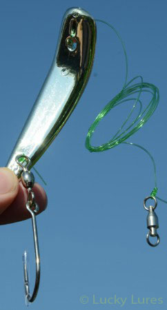 Der HOCKEY STICK arbeitet nach einem sehr wirksamen Prinzip: der Kopfbereich ist stark abgeknickt und kurz, ähnlich wie die Tauschaufel eines Wobblers. In diesem Bereich befinden sich zwei Löcher, durch die das fertig montierte Vorfach des Hockey Sticks so durchgeführt wird, dass es auf dem Rücken des lang gezogenen Körperteils liegt und durch ein Loch am Ende des Köders zu dem Haken des Köders führt. Der HOCKEY STICK ist also auf dem Vorfach aufgefädelt und wird beim Schleppen gegen den bzw. die Haken gedrückt.