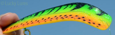 Meeres-Trolling-Köder müssen dem eingetrübten Wasser durch ihre Auffälligkeit trotzen. Hier empfiehlt sich das Schleppen mit Ködern, die auf das weltbekannte Fire-Tiger-Muster aufbauen. Dieser Hockey Stick ist beim Trolling auf schwere Lachse nicht wegzudenken. Die Farbgebung ist nicht ganz so kontrastreich wie beim klassischen Grundmuster, es wird dezent auf die Grundfarbelemente des Basis-Gelbs und schwarzen Striefen vertraut, wobei auf der einen Seite die Streifen auf grünlichem Hintergrund zur gelbe Ködermitte gezogen werden und auf der anderen Seite verlockenden Orange-Töne mit schwarzen Punkten den Köder perfekt abrunden. Dieser Trolling-Köder lockt die Fsiche von weiten Distanzen mit seiner enormen Auffälligkeit an. Besonders beim Trolling mit Downriggern, Sideplanern und Paravanen bringt dieser Jumbo-Köder beste Erfolge. Groß-Lachse lieben die schmale, langezogene Form dieses Trollingköders. Damit ist dieser Köder einer der Top-Kandidaten für das schnelle Trolling ab Schleppgeschwindigkeiten von 3,5 bis 4 kmh.